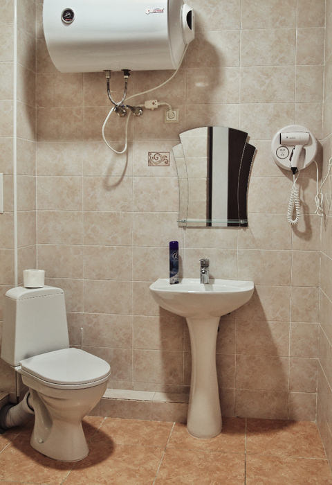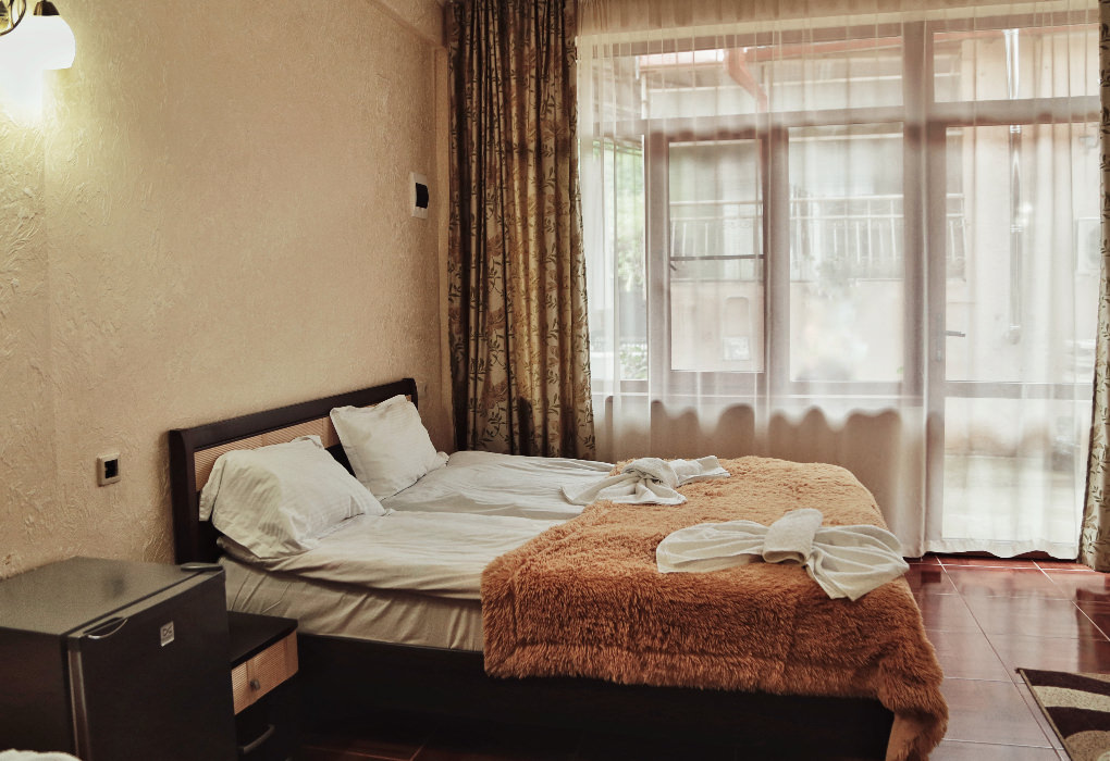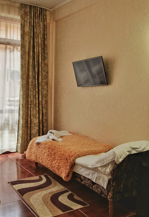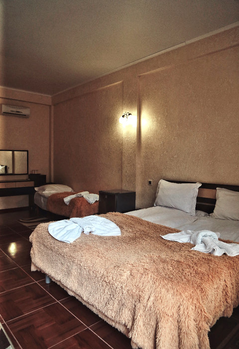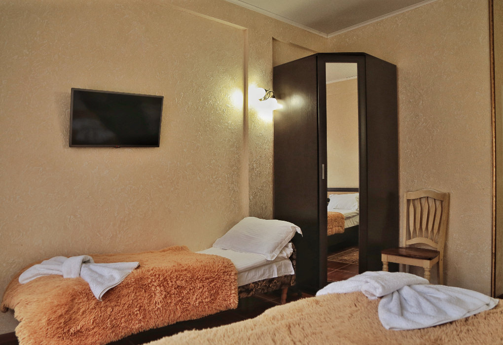 Площадь номера - 30 кв.м. 1 комната. 2 осн. места. две 1-спальные кровати, номера без балкона на 1-м этаже. В номере: телевизор; холодильник; кондиционер; душ; туалет; фен; электрочайник; 2-спальная кровать; водонагреватель. 2 доп. места: